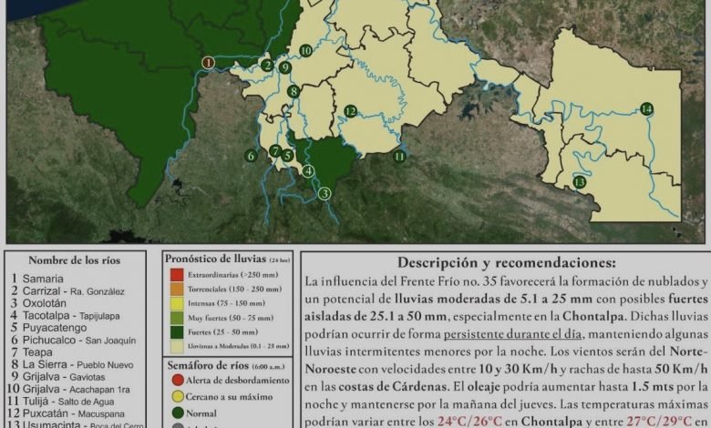 Frente Frío 35 favorecerá lluvias de moderadas a fuertes en La Chontalpa ++También habrá presencia de vientos del Norte con…