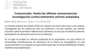 En el comunicado, la Fiscalía General de Tabasco, informó que dio inicio este lunes a una Carpeta Investigación (CI), pero sólo por los delitos de robo con violencia y los que “resulten”, por los hechos ocurridos sobre la carretera Villahermosa-Cárdenas y en los que se señala la presunta participación de elementos activos de la institución.