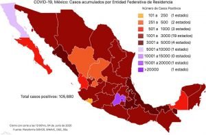 Y este viernes, la entidad que se mantenía en el bloque de entidades que tienen hasta cinco mil casos, que en el mapa de Covid-19 se ubican en color café, ahora pasará al bloque de entidades de color lila claro, que son los estados con más de cinco mil casos. Este jueves llegó a cuatro mil 997 casos acumulados de coronavirus.