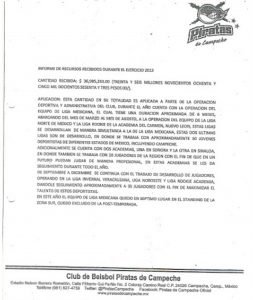 CONTRASTE POLÍTICO (CP) solicitó vía Transparencia los informes de uso de estos recursos públicos ejercidos por el equipo de béisbol, pero el Instituto del Deporte de Campeche, entregó una hoja impresa con el logotipo del equipo de Béisbol, pero sin firma alguna que pudiera evidenciar quien es la persona responsable de informar el uso de esos millonarios recursos.