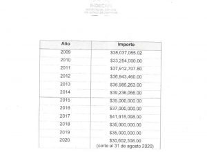 Fue en el año 2017 cuando el equipo recibió el monto mas alto del periodo con cerca de 42 millones de pesos, mientras que en el año 2010 fue cuando recibió el monto menor con 33 millones de pesos, y al 31 de agosto de este año, el equipo de béisbol ha recibido 30 millones de pesos.