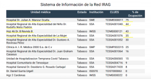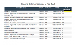 También, con datos hasta el martes 25, los pacientes críticos ocupaban el 40 por ciento de las camas con ventilador, en el HGZ 46 del IMSS; el 20 por ciento de camas con ventiladores en el Hospital Rovirosa; el 20 por ciento en el nosocomio de Comalcalco; y el 17 por ciento en el Hospital del Niño.