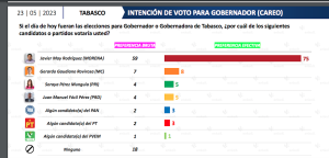 Los estudios de opinión efectuados por varias empresas, coinciden en que el también dos veces exalcalde de Comalcalco, exdiputado y exsecretario de Bienestar federal, lleva una amplia ventaja en las preferencias electorales, tanto ante aspirantes morenistas como de la oposición.