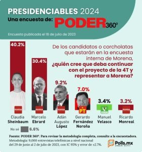 La encuestadora Poder 360° la coloca con un 40.02 % mientras que su más cercano competidor es Marcelo Ebrard con 30.04 %, la reciente encuesta publicada por el Financiero también le dan la victoria con una amplia ventaja del 45 %.