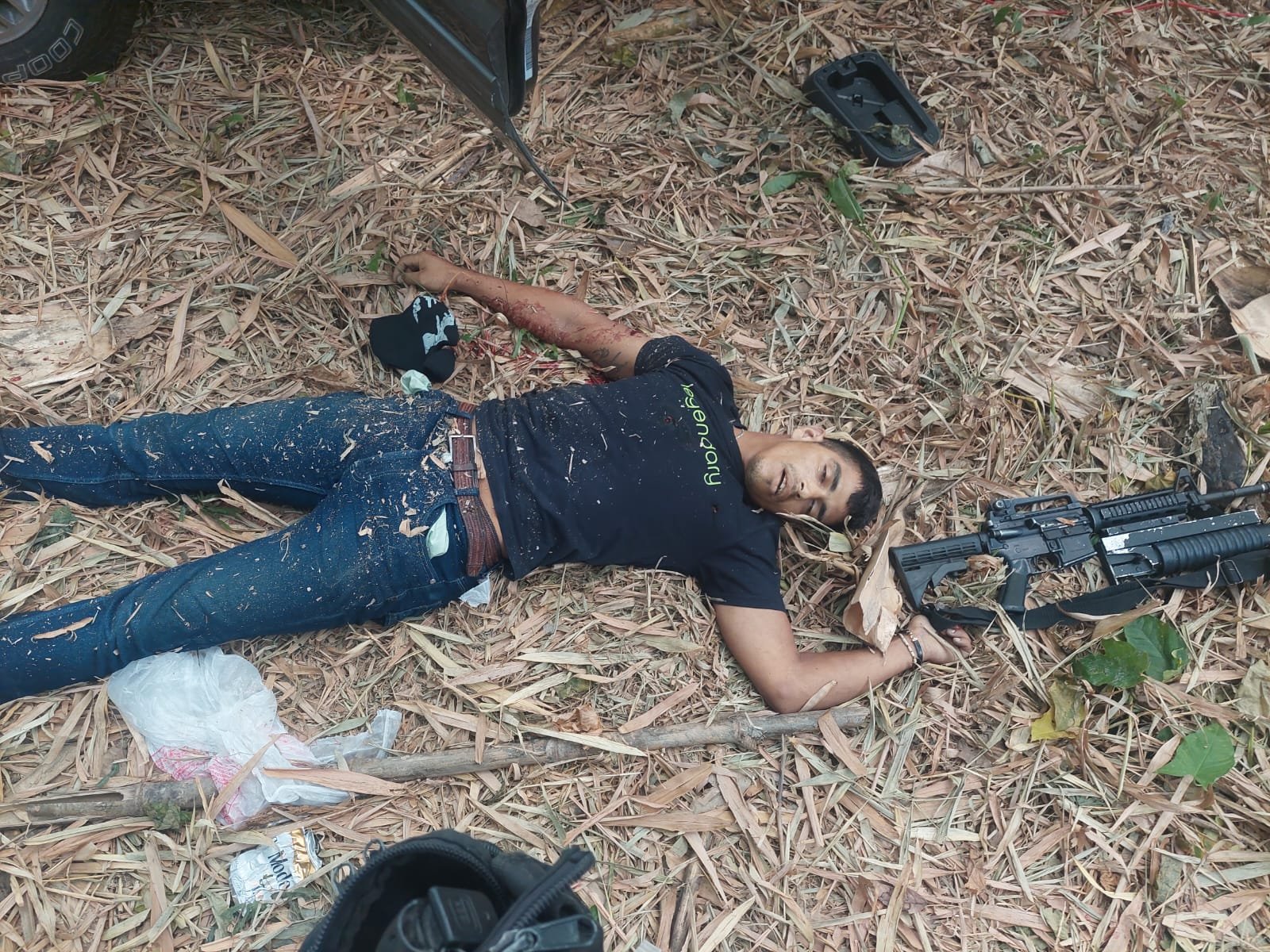 La balacera comenzó en un camino de terracería que conduce a unos cacaotales, ahí los sicarios se enfrentaron a tiros con miembros de la Secretaria de Seguridad y Protección Ciudadana de Tabasco, pero ni sus cuernos de chivos pudo protegerlos de la efectividad de los uniformados.
