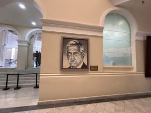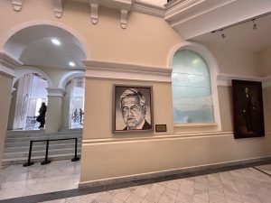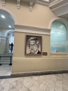 VILLAHERMOSA (CONTRASTE POLÍTICO).— Como un reconocimiento permanente por ser el primer tabasqueño y hasta ahora único en ser Presidente de la República, el gobierno de Tabasco colocó en la planta de palacio de gobierno una pintura de la imagen del “siempre presidente” Andrés Manuel López Obrador.