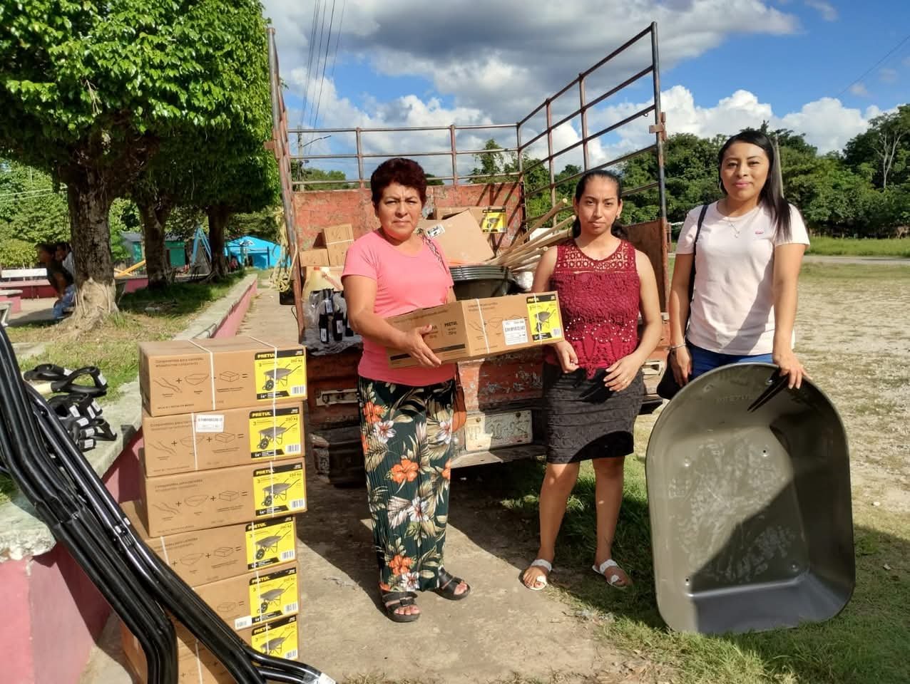 Cynthia Cecilia cada semana recorre las comunidades, a veces reparte a bajo costos pollitos, tinacos, materiales, bombas fumigadoras, Block hueco, laminas, quemadores de mesa, gallinas vivas, cilindros, cemento, machetes, palas y hasta motosierras.