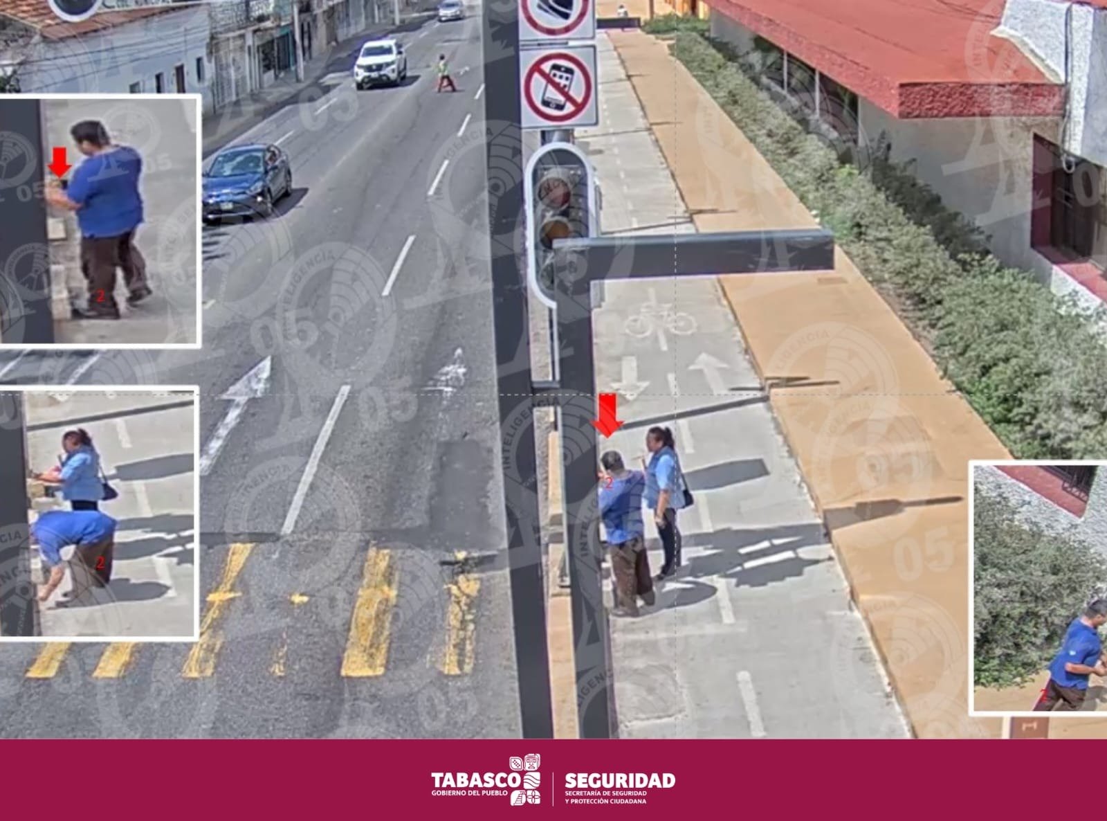 En otra ocasión las cámaras de videovigilancia captaron a un masculino de vestimenta playera color azul, pantalón color café y a una femenina de vestimenta blusa color azul, pantalón negro y bolso negro, en donde se observó al sujeto quien llevaba un objeto en su mano derecha, con el que al parecer manipuló el botón para el paso peatonal, seguidamente recogió algo del piso y volvió a manipular el botón, posteriormente caminó en dirección a la Casa de Artes ‘José Gorostiza’.