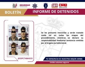 VILLAHERMOSA (CONTRASTE POLÍTICO).-Como parte de la estrategia antiextorsión, en recorridos preventivos por el Andador del Grabador, en Ciudad Industrial, la Secretaría de Seguridad y Protección Ciudadana (SSPC), en coordinación con la Fuerza Interinstitucional de Reacción Táctica (FIRT) Olmeca, detuvo a 4 masculinos, por su probable participación en delitos relacionados con la Ley General de Salud y su presunta partición en el cobro de piso, constitutivo del delito de extorsión.