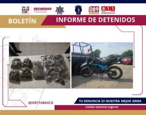 A los detenidos, identificados como Jonathan Manuel «N», Jesús Manuel «N», Mario Alberto «N» y Aldrin Israel «N», se les aseguraron drogas y una motocicleta. Además, 4 mochilas, bolsas de plástico transparente que en su interior contenían hierba seca con características similares a la marihuana, bolsas de plástico transparente granulosa con características al cristal, tres teléfonos, piezas de metal de varilla punteada conocidas como ponchallantas, dinero en efectivo y una motocicleta color azul.