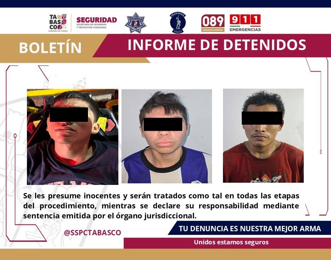 Los detenidos, quienes responden a los nombres de Darvin Uriel «N», Cristopher «N» y José Luis » N», fueron puestos a disposición de la autoridad competente, junto con los objetos asegurados, para iniciar las investigaciones correspondientes.