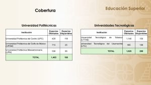 Las universidades politécnicas del Centro, del Golfo de México, ubicada en Paraíso, y la Mesoamericana en Tenosique; al igual que las universidades tecnológicas de Tabasco, ubicada en el municipio del Centro; del Usumacinta, ubicada en Emiliano Zapata; la Universidad Intercultural del Estado de Tabasco y la Universidad Popular de la Chontalpa, ofertan espacios disponibles.