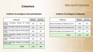 Refirió que los Institutos Tecnológicos Superiores de Centla, Comalcalco, Macuspana, La Venta, de los Ríos y de la Sierra, cuentan con espacios disponibles, lo mismo que instituciones educativas federales, como el Tecnológico de Villahermosa, de La Chontalpa y de Huimanguillo con oportunidades para estudiantes de nuevo ingreso.