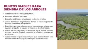 Precisó que los puntos viables para la siembra de árboles son las Áreas Naturales Protegidas (ANP); parques urbanos y rurales; escuelas públicas y privadas de todos los niveles; zonas dañadas o degradadas, donde la tierra ha perdido árboles; y ecosistemas valiosos como manglares y selvas, que ayudan a regular el agua y proteger la biodiversidad.