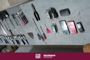 Durante la revisión por diversas áreas del CREST, se decomisaron 3 teléfonos celulares, un módem, una repisa doble fondo, 2 vapeadores, 1 cargador para celular, tijera, 1 pinza de corte tipo electricista, desarmadores, 6 tenedores metálicos, cucharas y cucharones metálicos, así como otros artículos de cocina que se podrían considerar de riesgo.