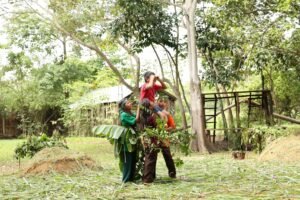 Los laboratoristas tuvieron que madrugar, alcanzando a bañarse con la luz de la luna plena, que les alumbró para afinar detalles del espacio escénico. Tres montículos donde se colocarían a dialogar una planta de naranja, de plátano y de manzano, “aunque solo sean capaces de oírlos los niños” para abordar la relación de los niños con la naturaleza, los desafíos que se presentan conforme van creciendo y comprendiendo el mundo de los adultos.