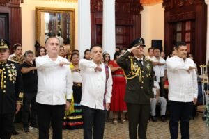 Junto a la presidenta honoraria del Sistema DIF Tabasco, Aurora Raleigh de la Cruz, así como representantes de los poderes de la entidad y las fuerzas armadas, el mandatario rindió honores a la enseña nacional, y desde el balcón principal del Palacio de Gobierno tocó la campana con la que se conmemoró el 215 aniversario del inicio del Movimiento de Independencia.