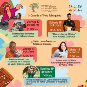 VILLAHERMOSA (CONTRASTE POLÍTICO).-Con una amplia cartelera que invita a disfrutar del arte, tradiciones y cultura tabasqueña, el Gobierno del Pueblo a través de la Secretaría de Cultura, está listo para celebrar del 17 al 19 de octubre la edición XVIII del Festival Cultural CEIBA, con una serie de actividades completamente gratuitas, hechas para que los chicos, se adentren a nuestras raíces y los más grandes, vuelvan a sentir la magia e historia del Barrio Mágico y río Grijalva.