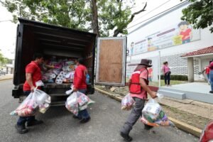 De preferencia, los donativos pueden ser agua embotellada, despensas armadas, víveres enlatados, productos embolsados como azúcar, café, sopa de pasta, lentejas y galletas; alimento y pañales para bebés, artículos de higiene personal e íntima, ropa en buen estado y limpia, y materiales de limpieza.