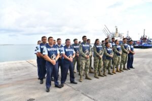 Al muelle, donde desde tempranas horas, voluntarios, integrantes de las fuerzas armadas y servidores públicos ayudaron en la organización de los suministros, asistieron igualmente el subsecretario de Gobierno, José Pablo Mora Gómez; el comandante de la III Región Naval, Juan Carlos Vera Salinas; representantes navales de la misma región; y la directora de Concertación y Enlace de la Secretaría de Gobierno, Ariana Ávalos Córdova.