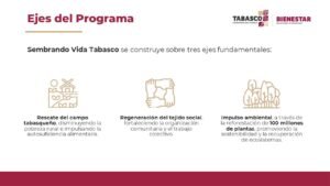 La estrategia que se traduce en el cumplimiento del compromiso número 18 del mandatario estatal, abundó López Hidalgo, está constituida sobre tres grandes ejes que reflejan la Cuarta Transformación: el rescate al campo tabasqueño, la regeneración del tejido social y el impulso ambiental, este último, con la meta de reforestar 100 millones de hectáreas en seis años.