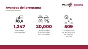 Detalló que, Sembrando Vida Tabasco, que opera actualmente en 14 municipios, ha realizado mil 247 asambleas informativas, esfuerzo que derivó en la incorporación de 20 mil hombres y mujeres, que a la fecha suman 30 mil hectáreas con sistemas agroforestales; así como la conformación de 509 Comunidades de Aprendizaje Campesino (CAC), donde sembradoras y sembradores conviven, intercambia saberes y trabajan de manera colectiva.