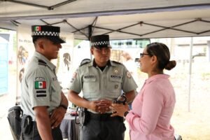 Por otra parte, el sargento segundo de la Guardia Nacional (GN), Oscar Antonio Saldaña Martínez, informó que su participación se basa en el servicio de proximidad social, que incluye labores de odontología, fisioterapia, peluquería para mujeres y hombres, actividades recreativas para niñas y niños, así como el módulo de reclutamiento al que los jóvenes se pueden acercar y conocer los requisitos para formar parte de la institución.