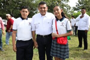 Después de atender al último habitante de la primera sección de Lomas Alegres, May Rodríguez se trasladó en compañía del representante del alcalde de Tacotalpa, José Juan Cruz Cadena; del director del EMSAD, Francisco Gómez Córdoba; y del secretario de Ordenamiento Territorial y Obras Públicas, Daniel Casasús Ruz, a los patios del centro escolar, donde ya estaban los bachilleres formados en grupos.