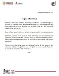 “Asimismo, Pemex aclara que no tiene injerencia con los directivos del certamen internacional Miss Universo y que la publicación de felicitación a Fatima Bosch Fernández se realizó en el marco del entusiasmo popular por su triunfo”.