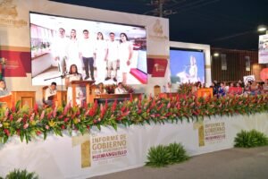 Durante la ceremonia realizada en el Parque Central “Benito Juárez”, Javier May participó en los honores a la bandera y escuchó el informe de inversiones, obras y resultados que Velázquez Jiménez presentó ante la ciudadanía. En su mensaje, la alcaldesa subrayó que el humanismo y la transformación han llegado a Huimanguillo de la mano del gobierno estatal y de la presidenta de México, Claudia Sheinbaum Pardo.