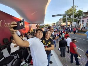 Uno de los puntos con mayor afluencia fue el parque Manuel Mestre Gigliaza, donde familias completas se dieron cita para observar el desfile. Ahí, las secretarias de Cultura, Bienestar, Educación y Desarrollo Agropecuario —Aída Castillo Santiago, Mayra Paloma López Hidalgo, Patricia Iparrea Sánchez y Luisa del Carmen Cámara Cabrales— presenciaron el recorrido de la caravana.