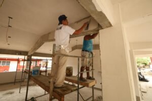 La reconstrucción incluye la edificación de una barda perimetral, colocación de loseta cerámica e impermeabilización, refuerzo estructural con acero en cadenas, castillos, trabes y losas, así como la construcción de banquetas, andadores y más de 120 metros cuadrados de concreto, entre otras mejoras.