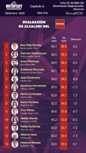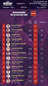 En el comparativo por filiación política, el estudio sitúa a Ovidio Peralta en el lugar 14 del ranking de alcaldes de Morena, reflejando un desempeño competitivo frente a sus pares a nivel nacional.