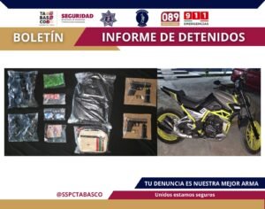 VILLAHERMOSA (CONTRASTE POLÍTICO).-Como parte de la Estrategia Nacional Antiextorsión y del Plan de Contención del Delito, la Secretaría de Seguridad y Protección Ciudadana (SSPC), en coordinación con la Fuerza Interinstitucional de Reacción Táctica Olmeca, realizó la detención de dos personas por su probable responsabilidad en delitos contra la Ley General de Salud y portación de armas de fuego.