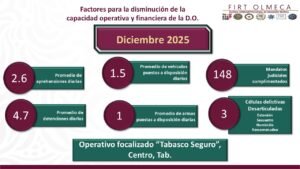 Entre las capturas más destacadas, se mencionó la detención de Abel “N”, alias “Inge”, realizada el 1 de diciembre en Paraíso; Pedro “N”, detenido el 11 de diciembre en Nacajuca; y Eduardo “N”, alias “Luky”, asegurado el 27 de diciembre en el municipio de Centro.