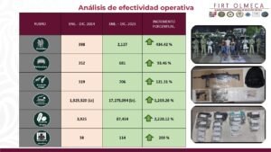 De acuerdo con el informe, de enero a diciembre de 2025 se registró, en comparación con 2024, un incremento del 434.42% en personas detenidas. También se reportó un aumento del 2228.12% en el aseguramiento de dosis de droga, 1203.26% en litros de hidrocarburo ilícito, 121.31% en armas de fuego y 93.46% en vehículos asegurados.