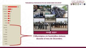 El funcionario subrayó que nueve municipios de Tabasco no registraron ningún homicidio doloso durante el último mes del año, lo que representa la mitad del territorio estatal, reflejo —dijo— del trabajo coordinado entre fuerzas estatales y federales.