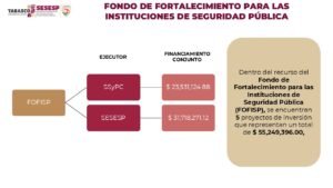Del FASP se destinarán 354.7 millones de pesos, mientras que el FOFISP aportará 55.2 millones de pesos, recursos que se invertirán en radios, drones, patrullas, videovigilancia, identificación vehicular, capacitación, certificación policial y equipamiento penitenciario, además de obras en juzgados penales y acciones contra feminicidio y extorsión.
