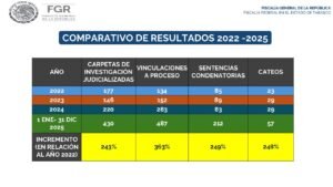Al presentar un comparativo histórico, subrayó que estos resultados representan incrementos del 249% en sentencias condenatorias y del 248% en cateos, en comparación con 2022. Además, se judicializaron 430 carpetas de investigación y se obtuvieron 487 vinculaciones a proceso, lo que implica un aumento del 243%.