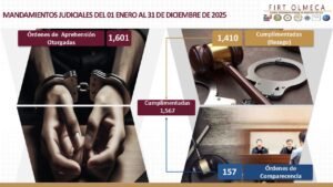 Durante la presentación del Informe de Seguridad del Gobierno del Pueblo, el titular de la Fiscalía General del Estado de Tabasco (FGE), Oscar Tonathiu Vázquez Landeros, informó que del 1 de enero al 31 de diciembre de 2025 se emitieron 1,601 órdenes de aprehensión, de las cuales la gran mayoría fueron ejecutadas con el respaldo de instancias judiciales y cuerpos de seguridad.