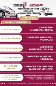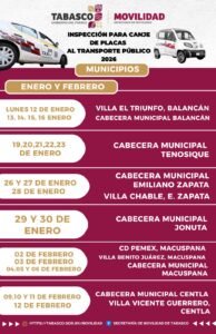 La Semovi detalló que los módulos itinerantes ya se encuentran operando en municipios como Balancán, Tenosique, Emiliano Zapata, Jonuta, Nacajuca, Jalpa de Méndez, Huimanguillo, Macuspana, Centla, Teapa, Tacotalpa, Jalapa, Cárdenas, Cunduacán, Comalcalco, Paraíso y Centro, conforme a un calendario previamente establecido.