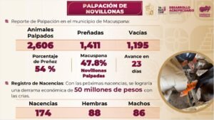 Precisó que en 2025 se entregaron 545 paquetes ganaderos, equivalentes a 545 sementales y 5 mil 450 novillonas, mismas que actualmente son evaluadas mediante palpación con ultrasonido, proceso que al 25 de enero registra un avance del 47.8%.