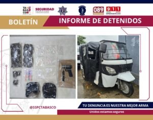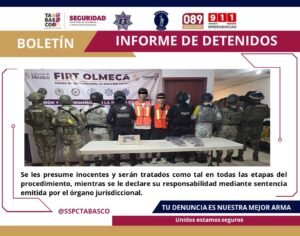 VILLAHERMOSA (CONTRASTE POLÍTICO).-Elementos de la Secretaría de Seguridad y Protección Ciudadana (SSPC), en coordinación con la Fuerza Interinstitucional de Reacción Táctica Olmeca, detuvieron a dos hombres por su presunta responsabilidad en delitos contra la Ley General de Salud y la Ley Federal de Armas de Fuego y Explosivos.