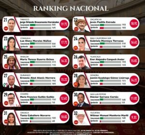 Los datos colocan a Tabasco en el lugar 22 del ranking nacional, muy lejos de las entidades mejor evaluadas, donde los presidentes de la JUCOPO superan el 38% de aprobación, evidenciando una crisis de liderazgo, visibilidad y legitimidad política en el Congreso local.