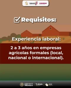 El programa está dirigido a trabajadoras y trabajadores del campo con experiencia comprobable de dos a tres años en empresas agrícolas formales, ya sea a nivel local, nacional o internacional. La vacante ofrece una ruta de empleo formal que reconoce la trayectoria laboral y garantiza apego a la normatividad vigente.