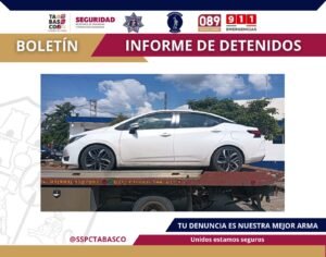 Entre los detenidos se encuentra Gabriel Alejandro “N”, alias El Gabo, de 24 años; Diana Laura “N”, de 28; María Félix “N”, de 47; Luisa “N”, de 34; además de una menor de 17 años de edad. Durante el operativo también fue asegurado un vehículo Nissan Versa, modelo 2024, color blanco, con placas del estado de Tabasco.