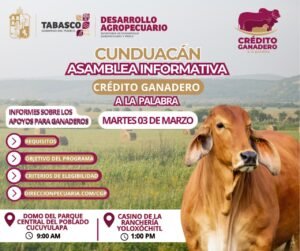 VILLAHERMOSA (CONTRASTE POLÍTICO).-La Secretaría de Desarrollo Agropecuario y Pesca de Tabasco (SEDAP) iniciará este 3 de marzo los censos y asambleas informativas del programa Crédito Ganadero a la Palabra en los municipios de Cunduacán, Jalpa de Méndez y Nacajuca.