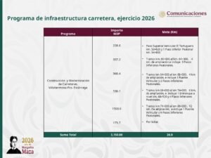 Entre las obras prioritarias se encuentra la modernización de la carretera Macuspana–Escárcega, donde se contempla la ampliación de 26 kilómetros de vía, además de la construcción del paso superior vehicular El Tortuguero y la reconstrucción del puente El Pechocho.