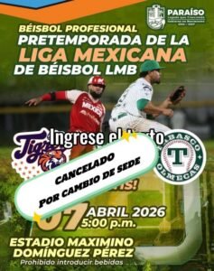 PARAÍSO (CONTRASTE POLÍTICO).-El juego programado para este martes 7 de abril en el municipio de Paraíso fue cancelado en su sede original y trasladado a la capital del estado, informó el Ayuntamiento, encabezado por Alfonso Baca Sevilla.