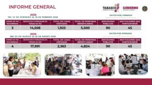 VILLAHERMOSA (CONTRASTE POLÍTICO).-La estrategia de atención social en Tabasco avanza con la implementación de Jornadas y Escuelas de Paz, que de enero a marzo de 2026 han beneficiado a más de 11 mil ciudadanos, informaron autoridades estatales.